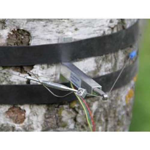 DC2樹干周長生長變化傳感器是DC1樹干周長生長變化傳感器的改進版本。鋼絲繩的拉力改為徑向設置。這樣鋼絲繩對樹的壓力和樹徑無關,不同樹徑的測量結果可直接比較。傳感器通過一個由熱膨脹系數低的合金制成的鋼絲繩固定在樹上。用小塑料環減少鋼絲繩對樹的壓力,并減少摩擦阻力,大大提高靈敏度。