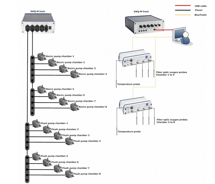 該系統(tǒng)基于光纖傳感技術(shù),由軟件和硬件設(shè)備組成,能在八個任意大小、形狀、體積的呼吸室里自動測量動物對氧的消耗率。還可兼容測量水溫的設(shè)備以及實時補償氧氣值軟件。需要針對實驗動物對象配備合適的試驗呼吸室chambers,以及匹配的8個光纖袖珍氧氣傳感器。